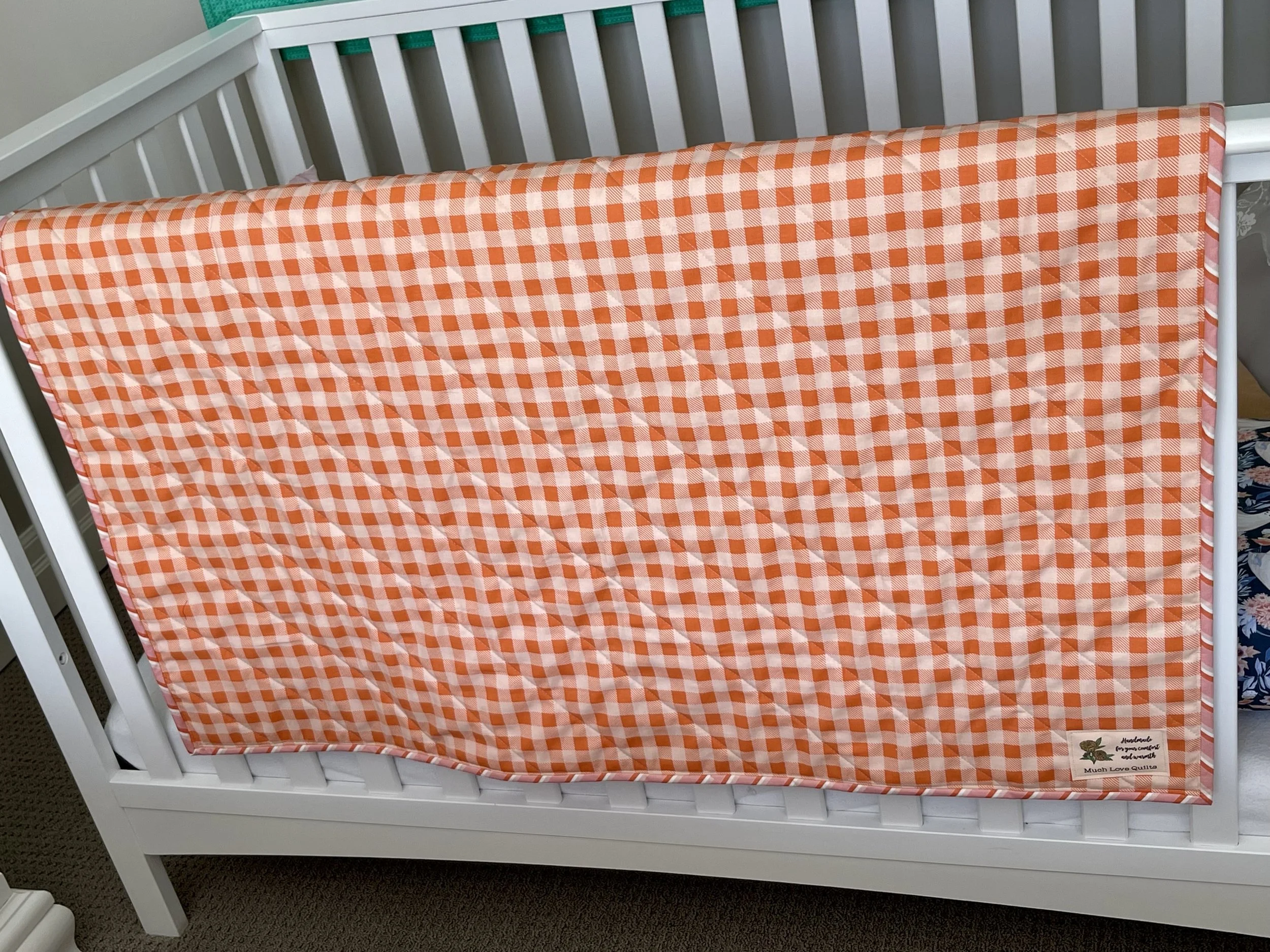 Materials: All new 100% cotton quilting fabrics. Quality 80% cotton 20% poly batting which is breathable, soft and adds a lovely cosiness to the quilt. Double fold binding is machine stitched to the quilt. Fabrics have not been pre-washed so first washing will produce a delightfully wrinkly result and 3-5% shrinkage will occur.
