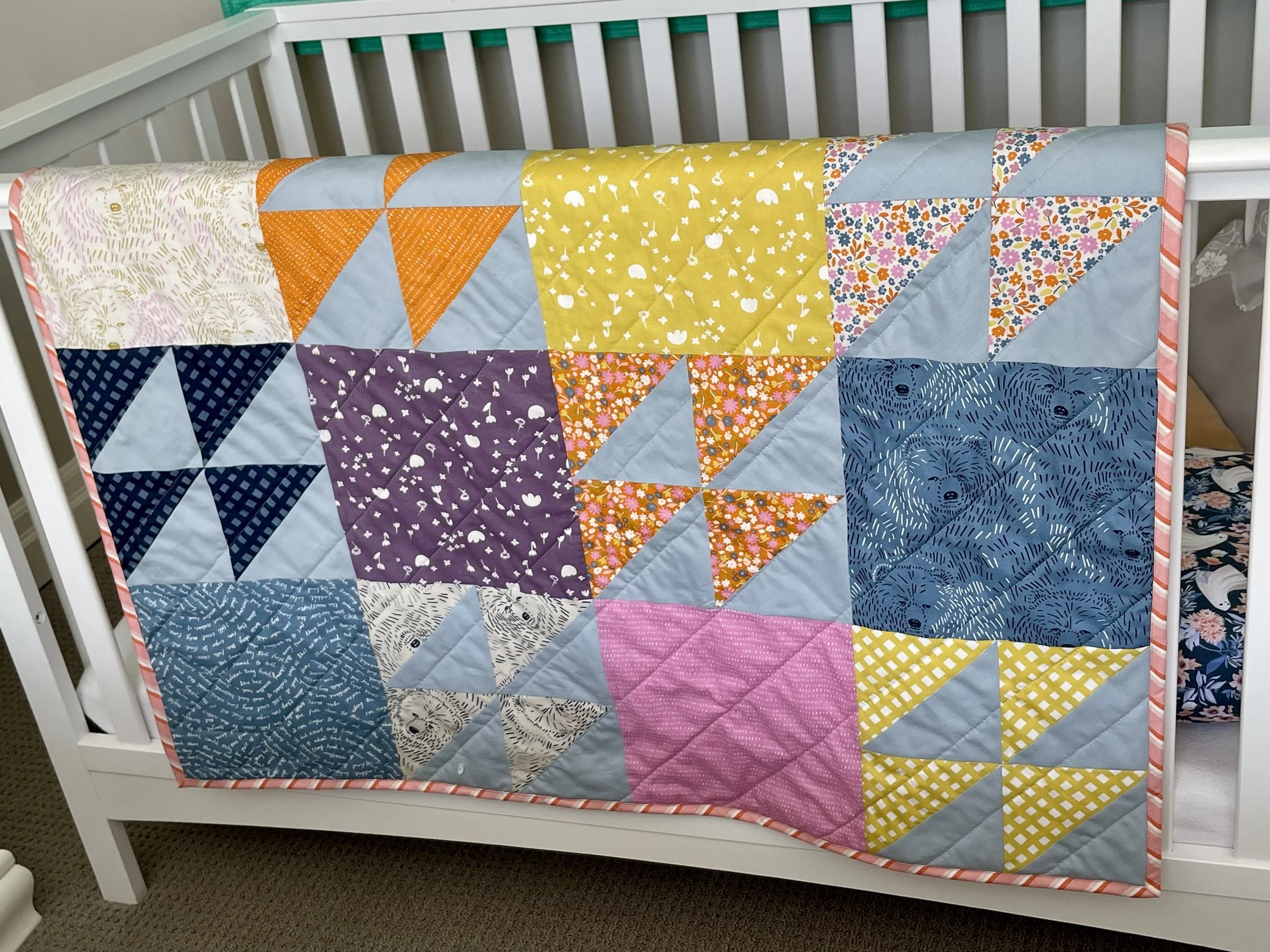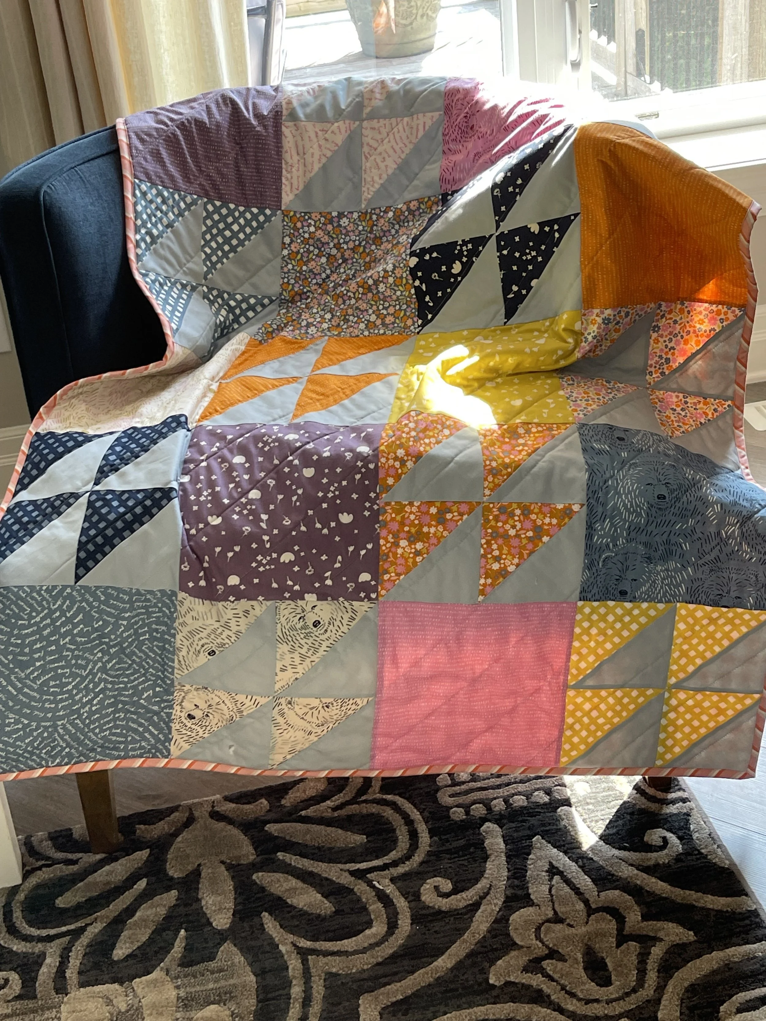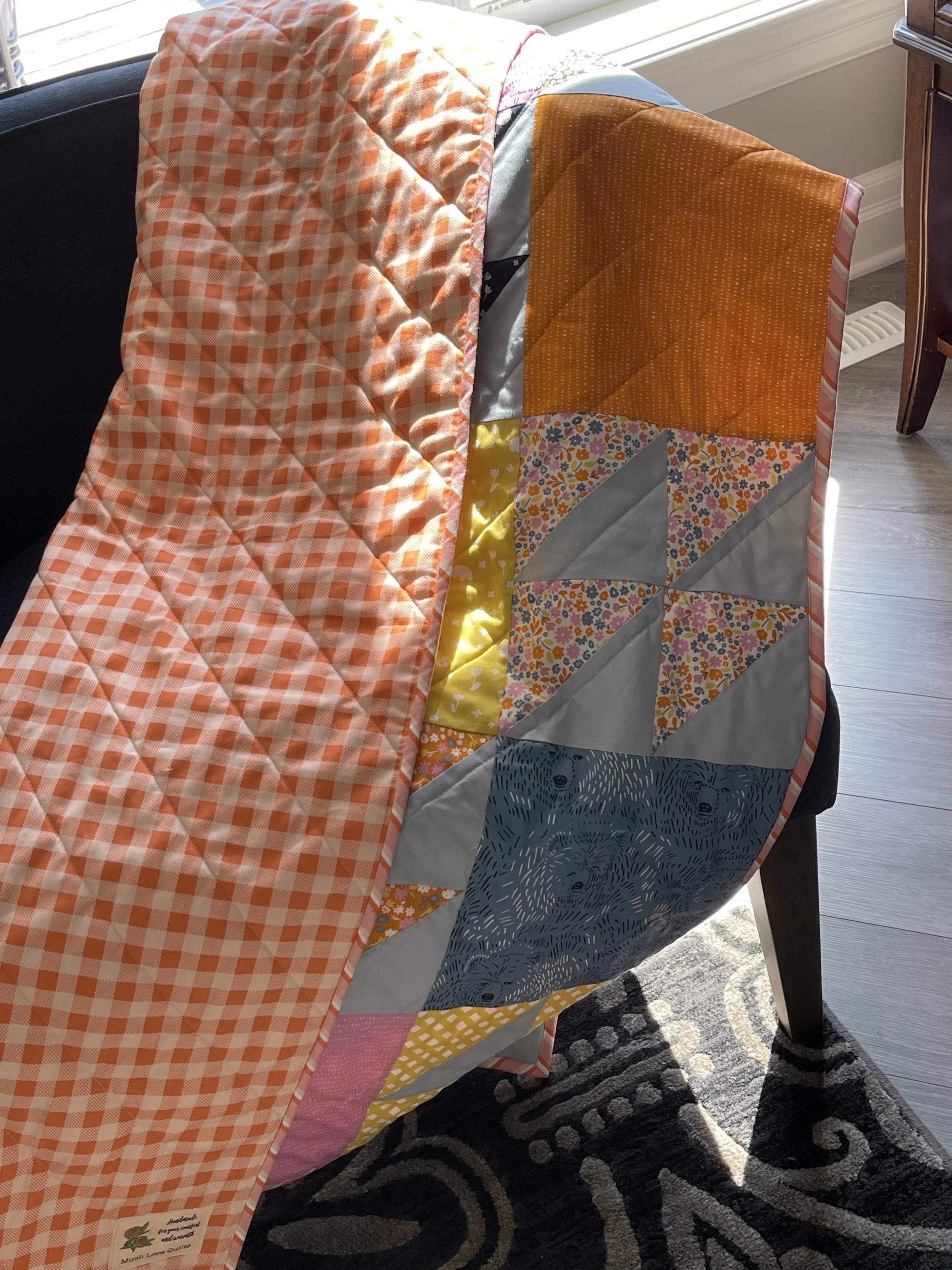 Quilt is made from an adorable collection featuring abstract drawings of bears along with florals, checks, dashes and script. Sweet baby/toddler quilt. Super cozy.