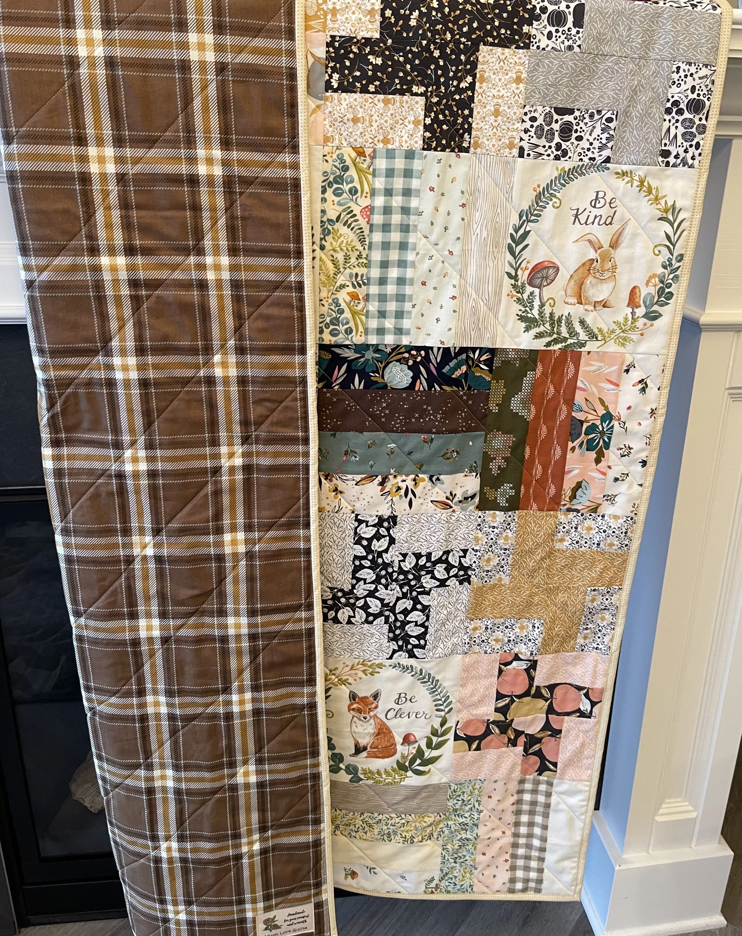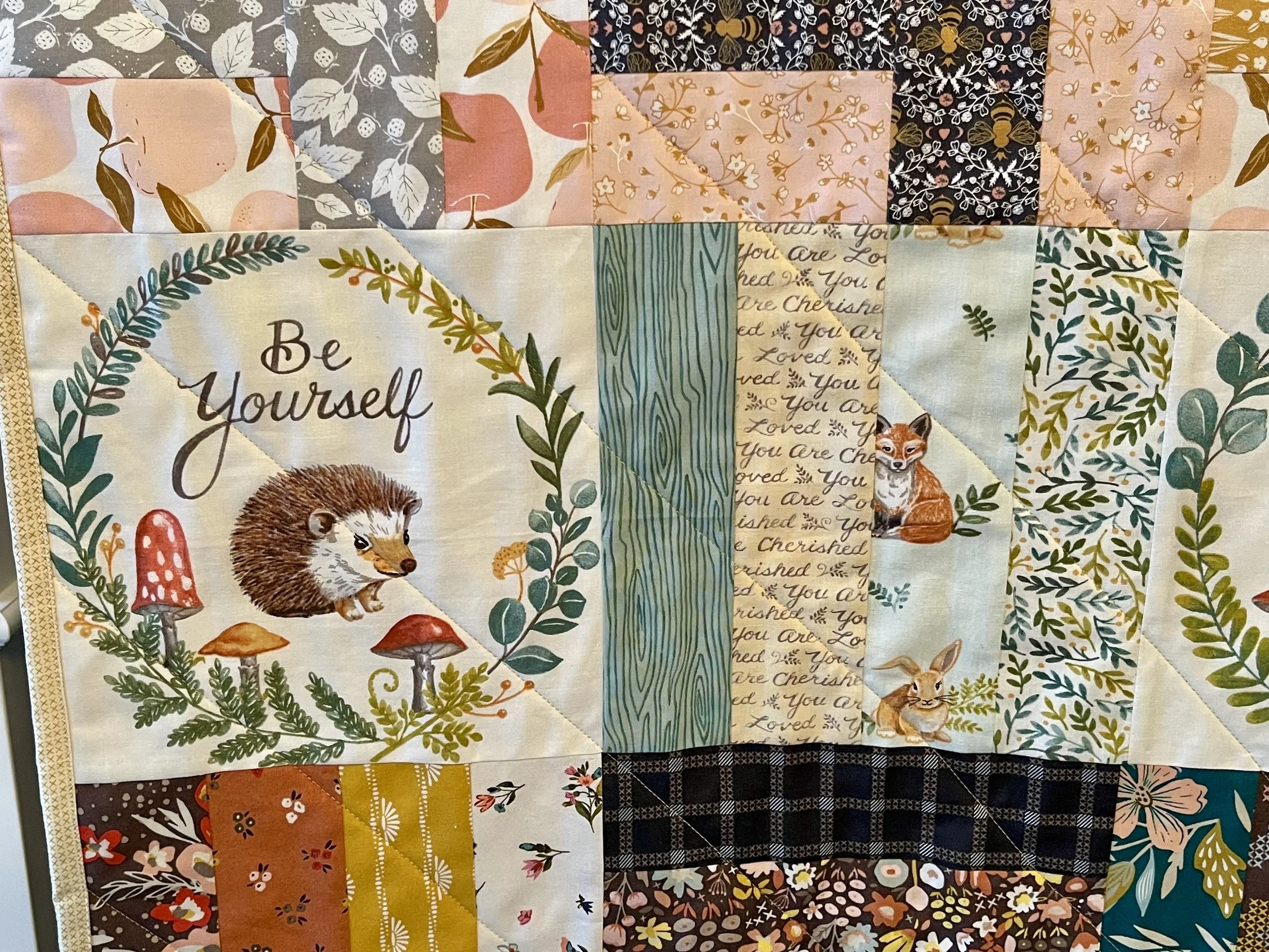 Woodsy Wisdom is an adorable quilt for a child up to 4 ft tall. I pulled together leftover blocks from several quilts plus used a panel of sweet animals imparting little wisdoms. My favourite is the hedgehog stating “be yourself”. The blocks are all from Moda fabric designers and there is a cohesion of earthy colours and images.