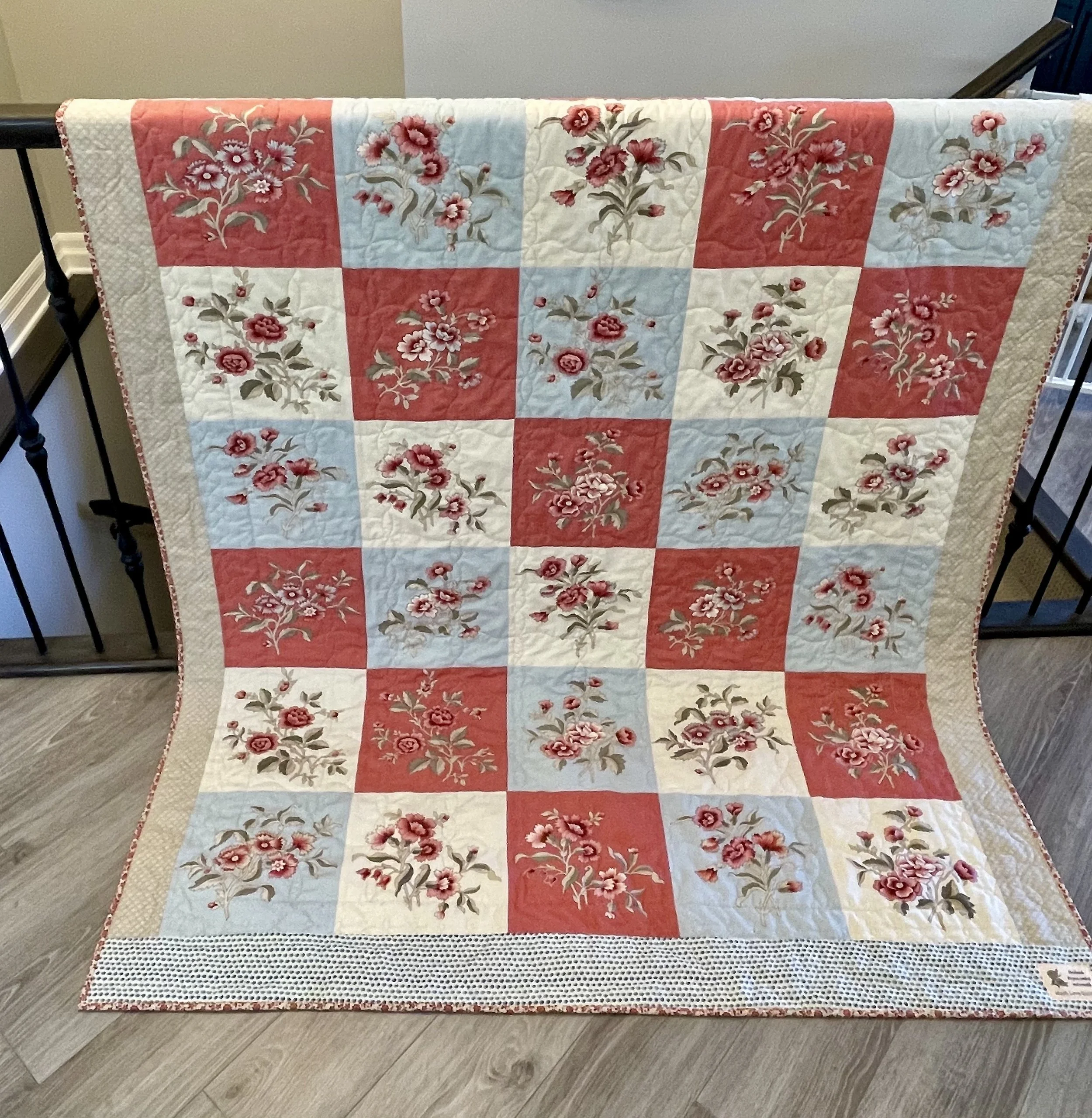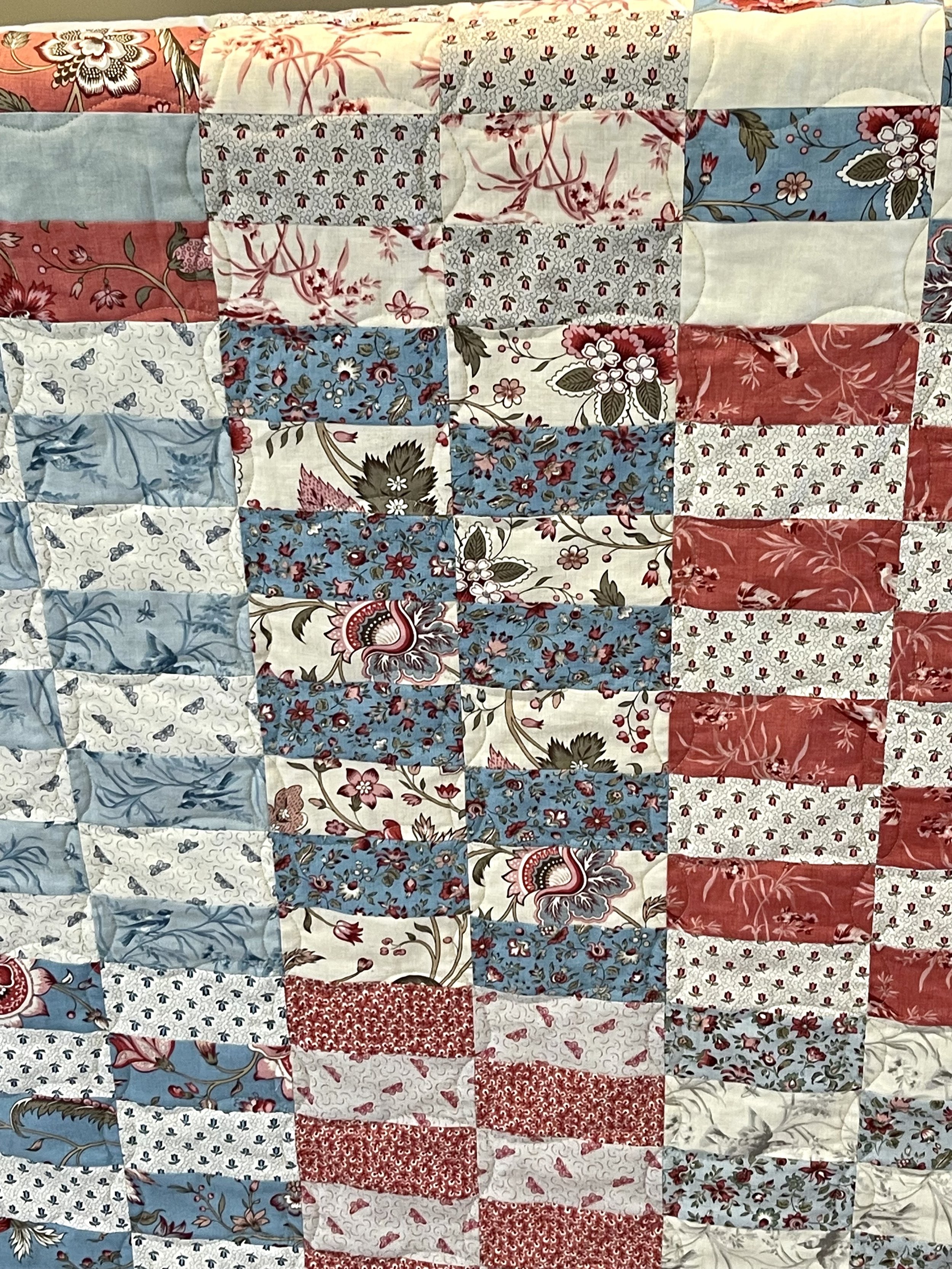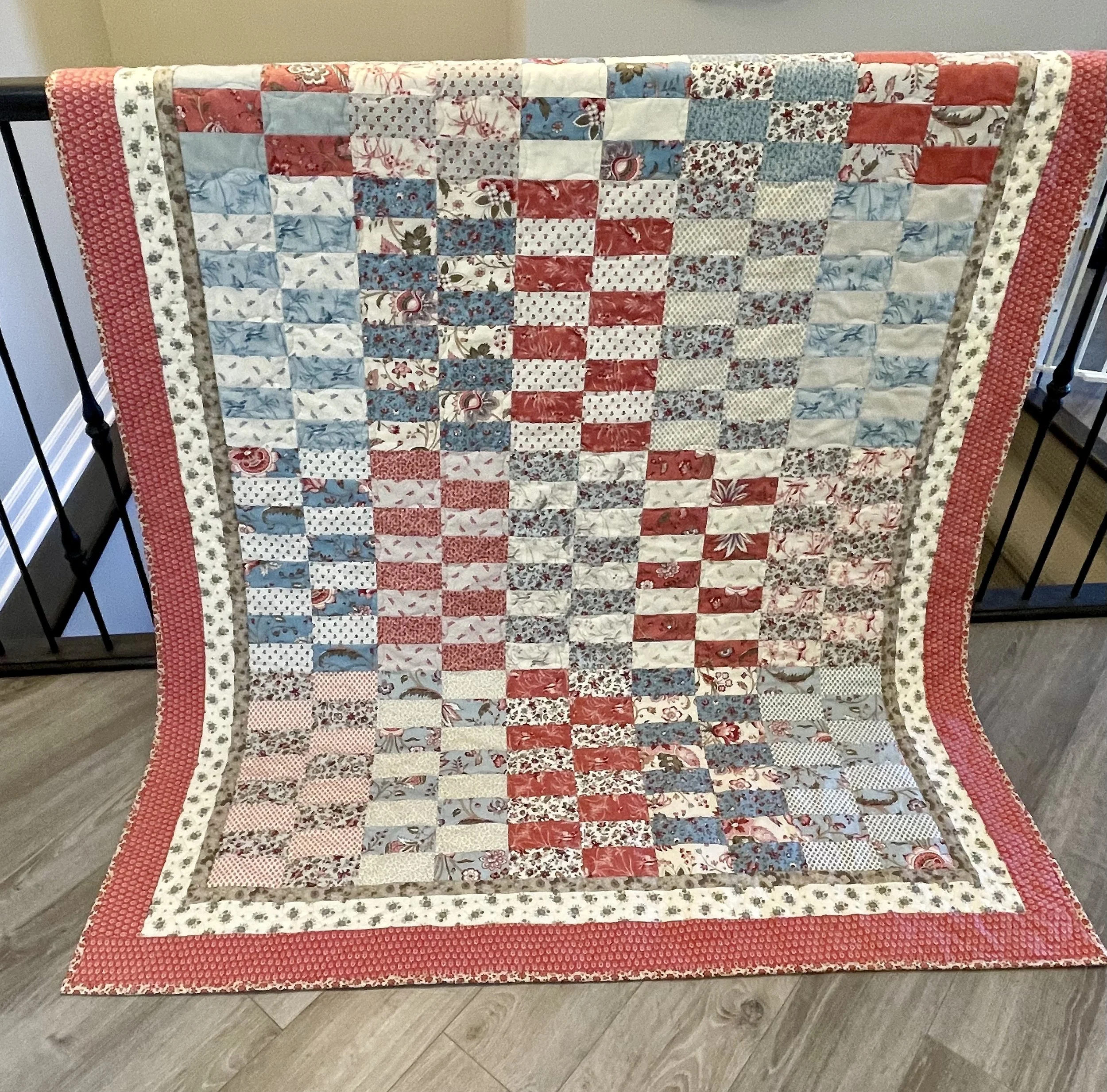 Un Duo is a cozy delightful throw or twin quilt. Pretty fabrics are all from French General by Moda. French General creates reproduction prints inspired by antique french linens. Very romantic in muted blues, reds , taupe and cream. I pieced a special backing from some floral panels to make a truly reversible quilt!