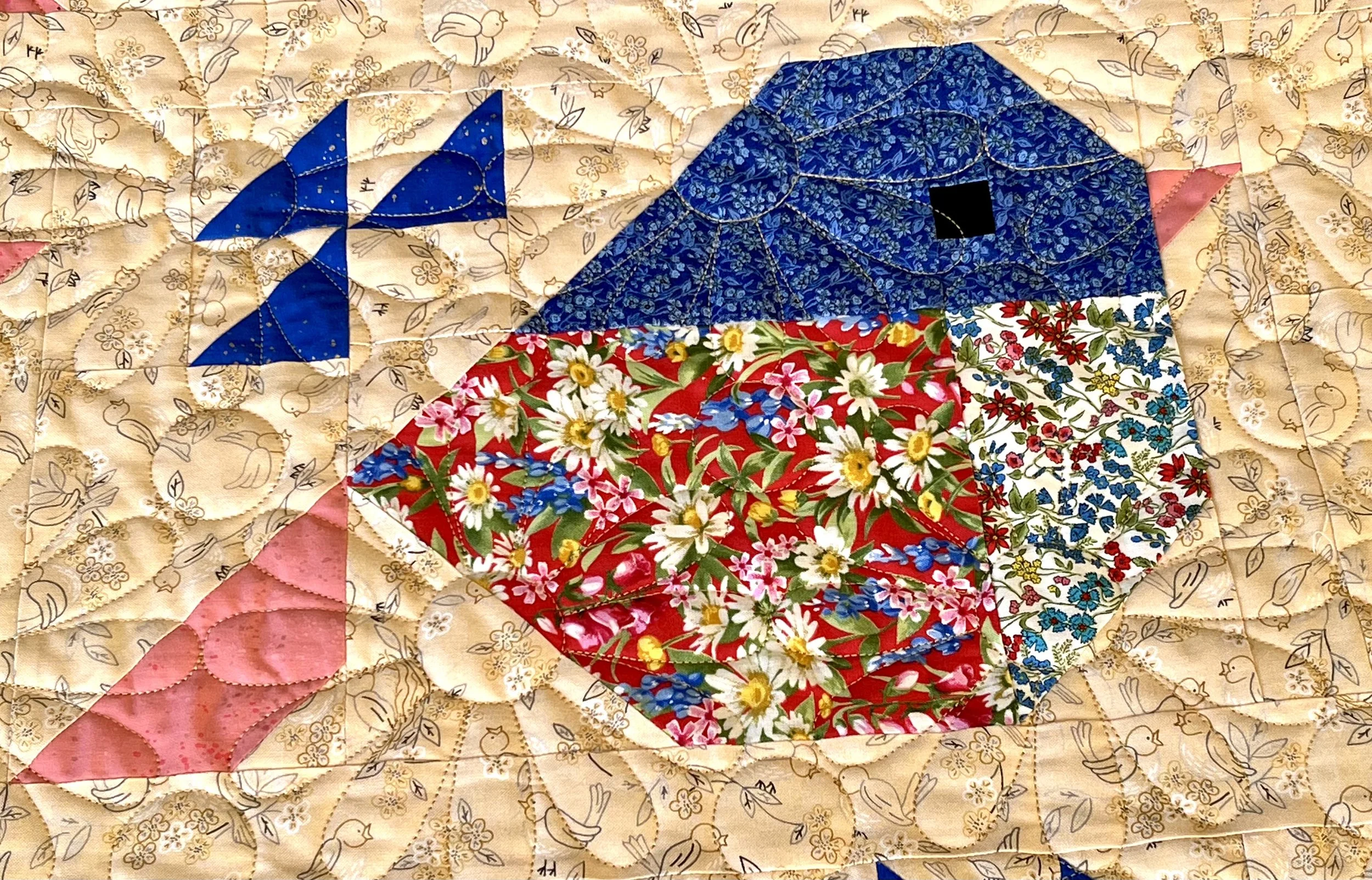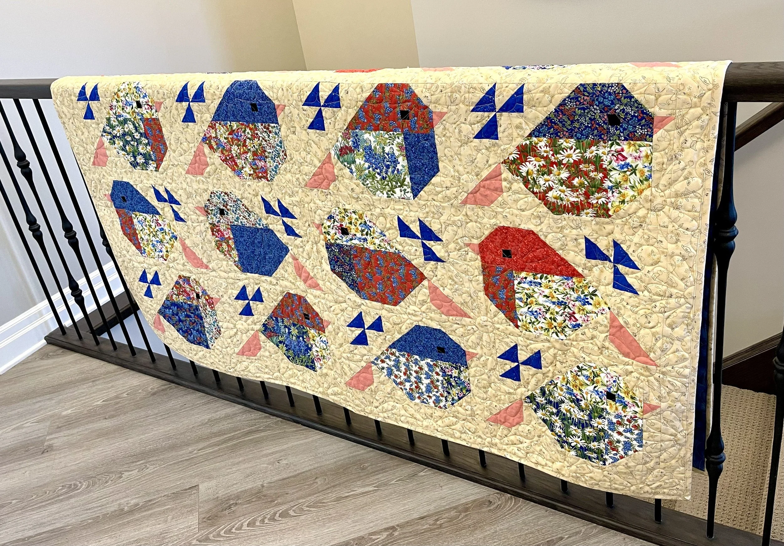 Sparrows is a quilt pattern I have been wanting to make for a very long time. I love the whimsy of these chubby birds. I constructed the birds from a selection of wildflower prints. I can’t help but think the birds would like that. It just makes you smile. The background fabric has tiny birds on it in various poses. A large throw sized quilt suitable for the foot of the bed or for the couch. Perfect for a sunroom or a dreary room you wish to make sunny!