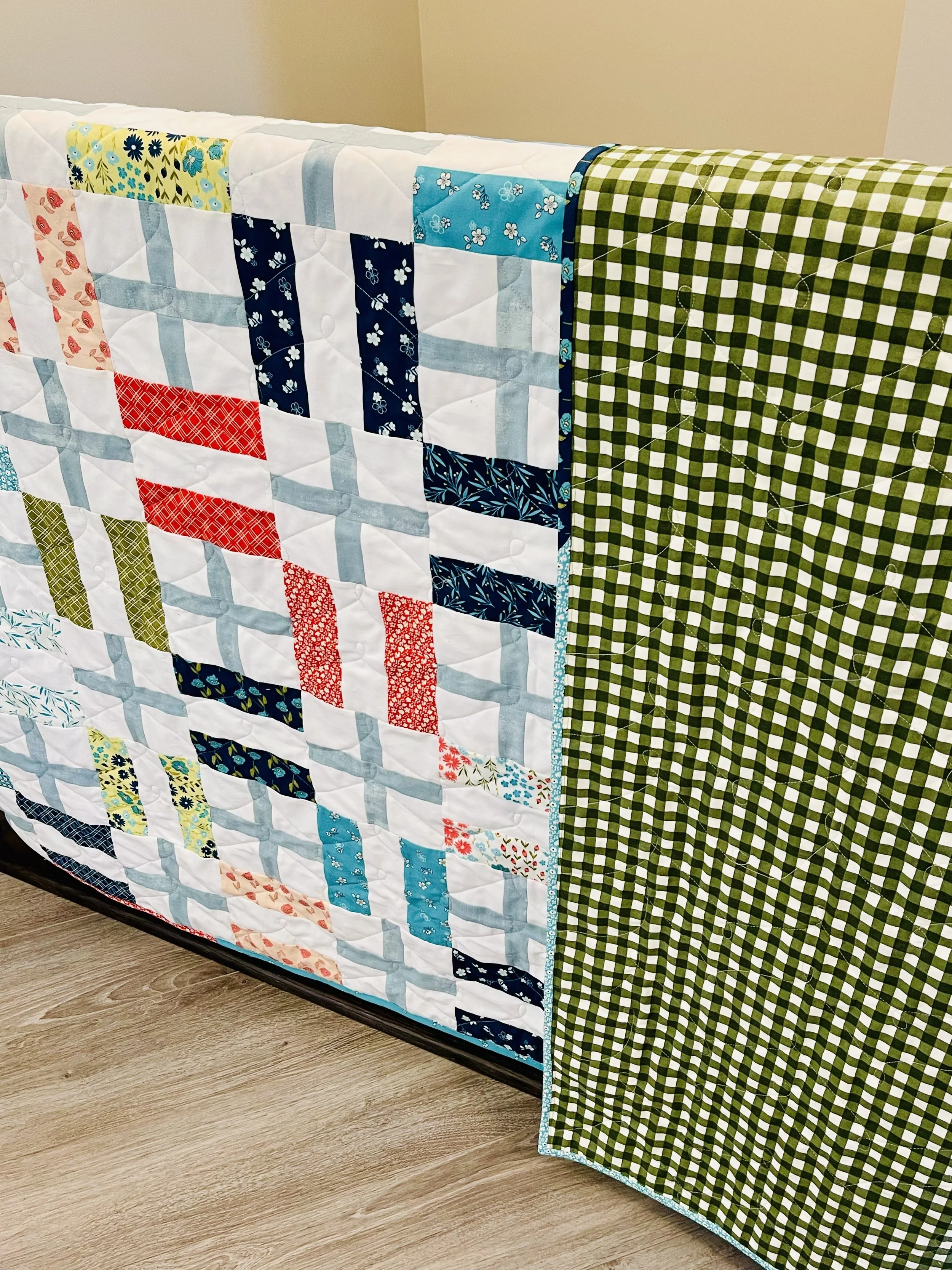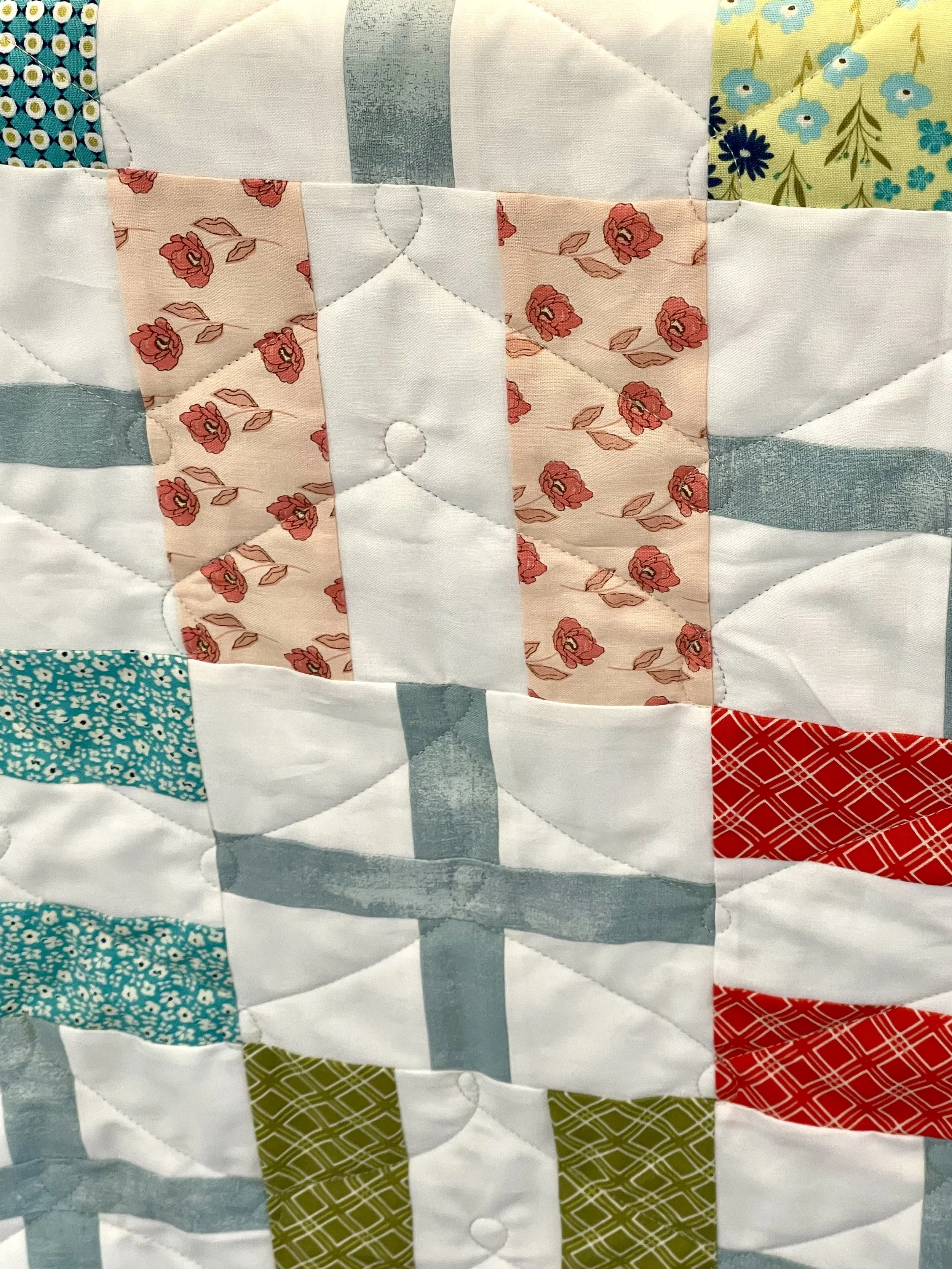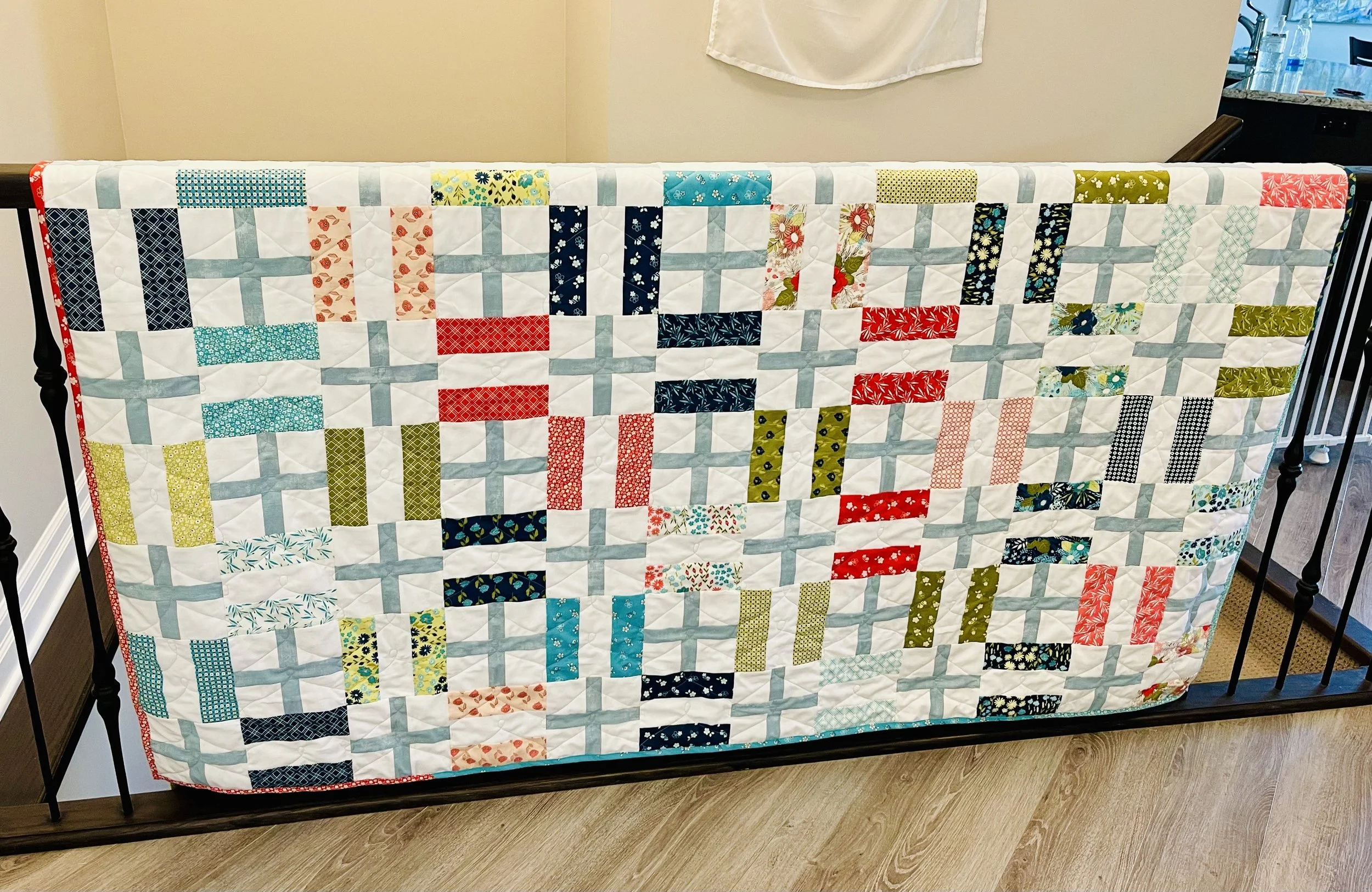 Positivity is a generous twin size or double. A fresh, light design sure to brighten your room. Free motion quilted by me.