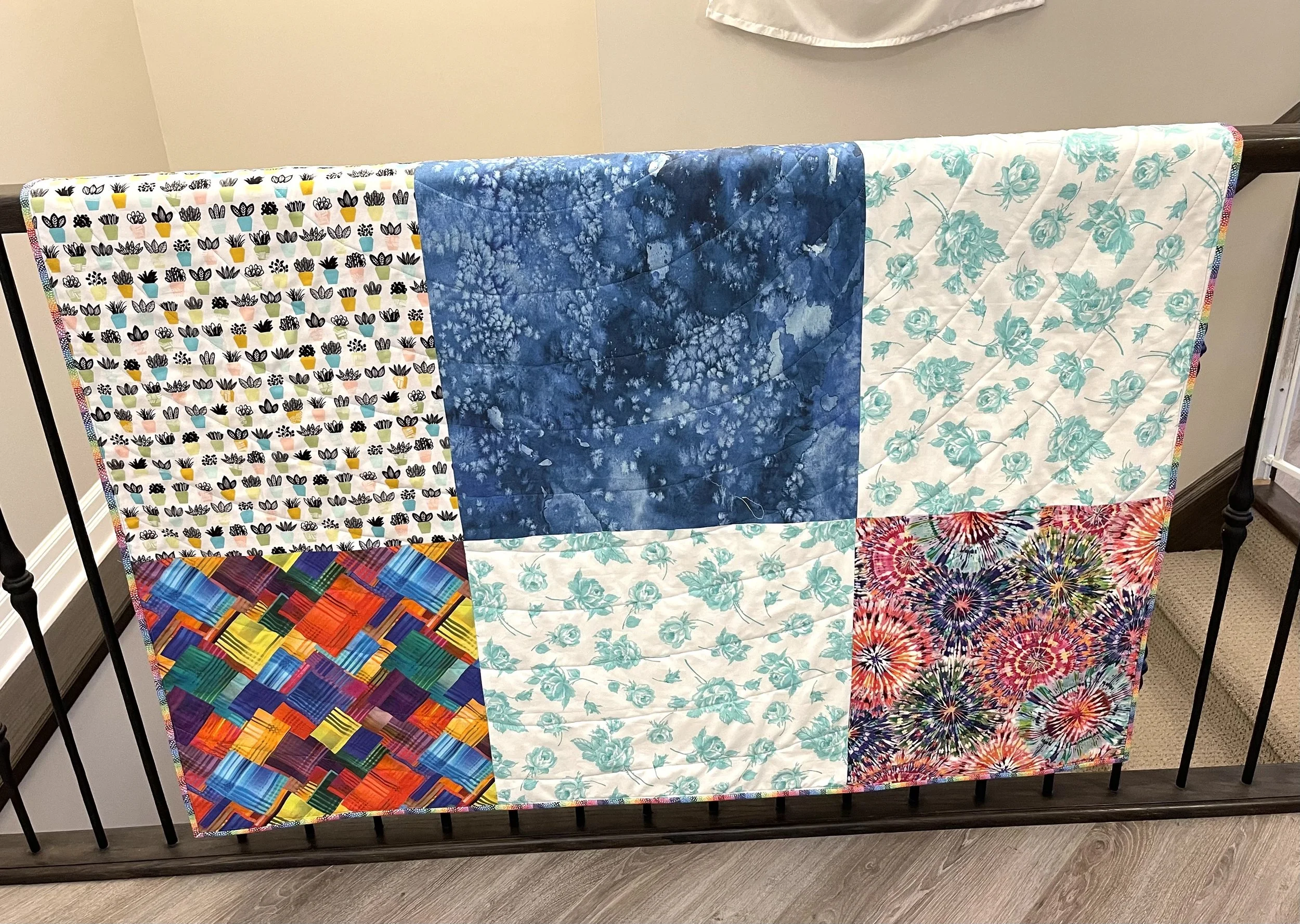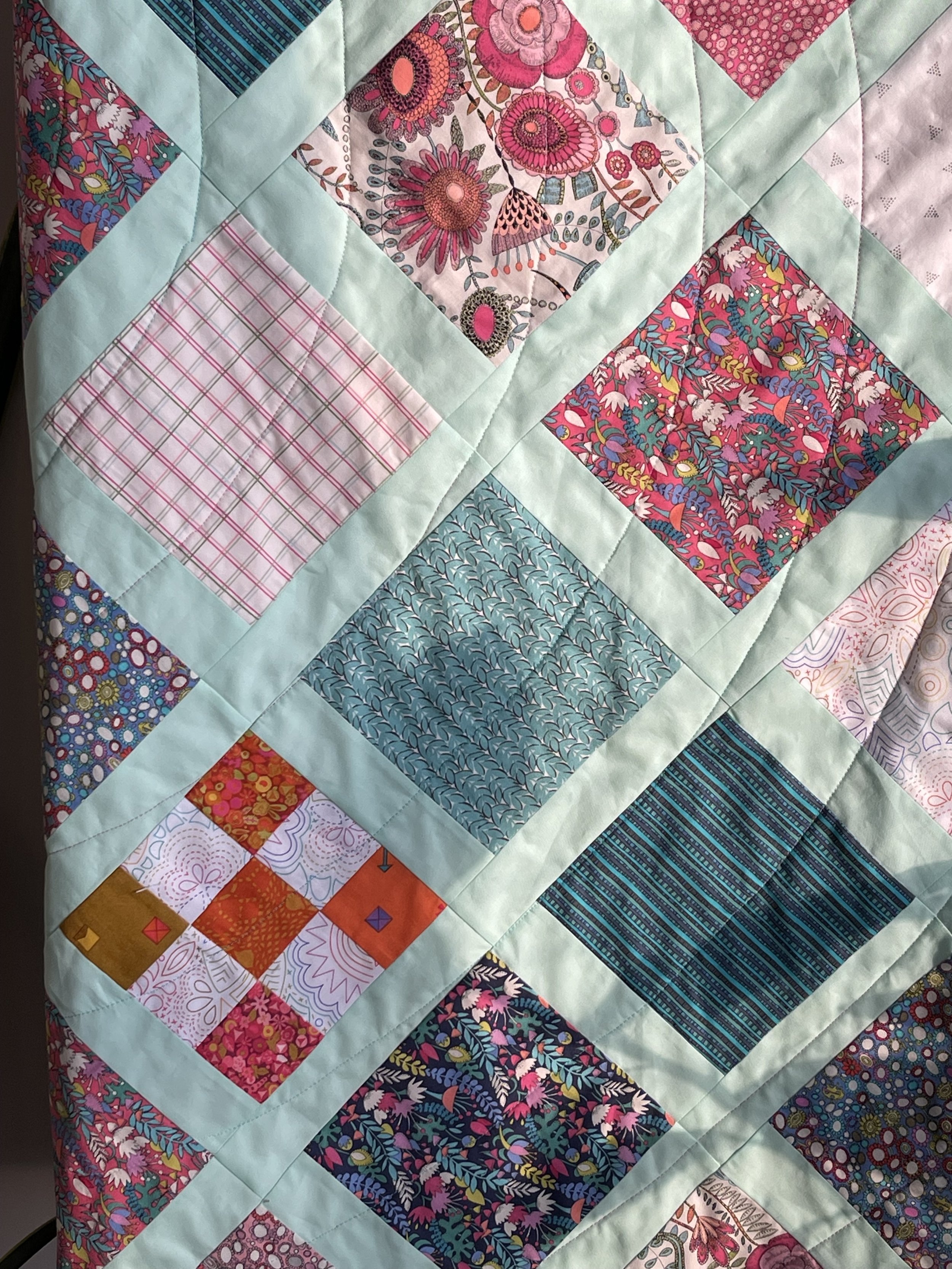 A pretty and colourful quilt with diagonal squares and minty sashing. I had ben saving 6 1/2” squares for just such a project!